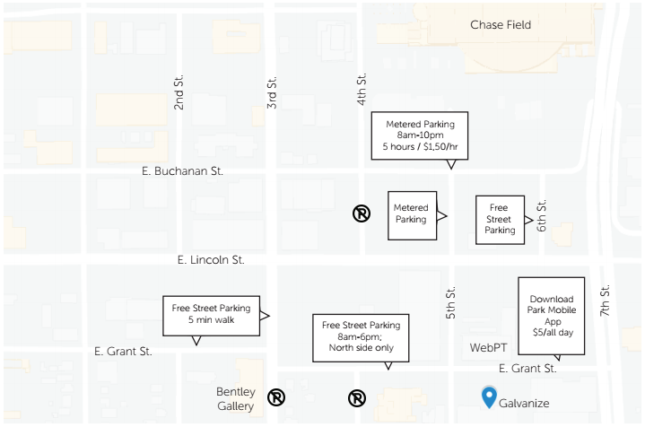 All are a 15 minute ride from the airport using taxis or ride sharing. Using the light rail is also convenient but takes a little bit longer at about 40 minutes The 3rd st. and Washington Light Rail Station is the closest station coming from the airport. From any downtown hotel it is a quick 5 minute ride (about a mile) to Galvanize.