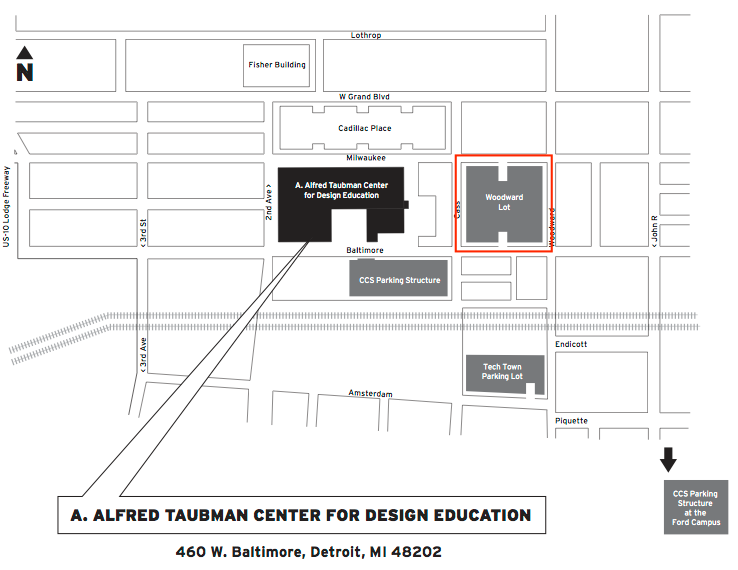 Attendee Parking is available free of charge at the Woodward Lot, located on Baltimore between Cass and Woodward. (Highlighted in red below)