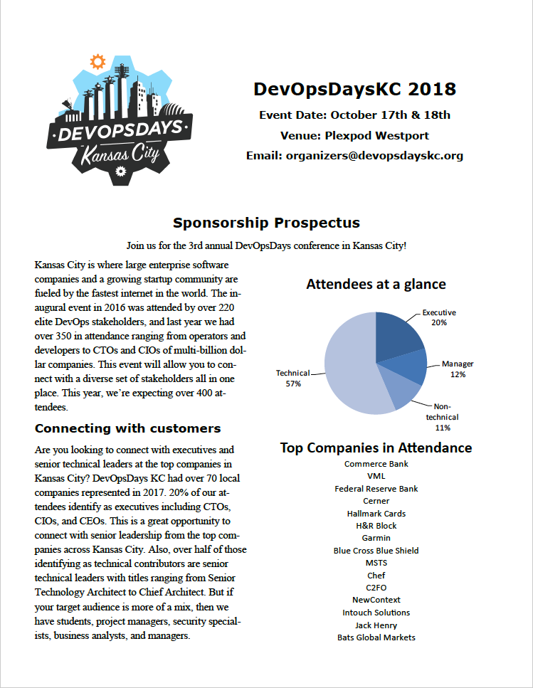 devopsdays is a self-organizing conference for practitioners that depends on sponsorships. We do not have vendor booths, sell product presentations, or distribute attendee contact lists. Sponsors have the opportunity to have short elevator pitches during the program and will get recognition on the website and social media before, during and after the event. Sponsors are encouraged to represent themselves by actively participating and engaging with the attendees as peers. Any attendee also has the opportunity to demo products/projects as part of an open space session.